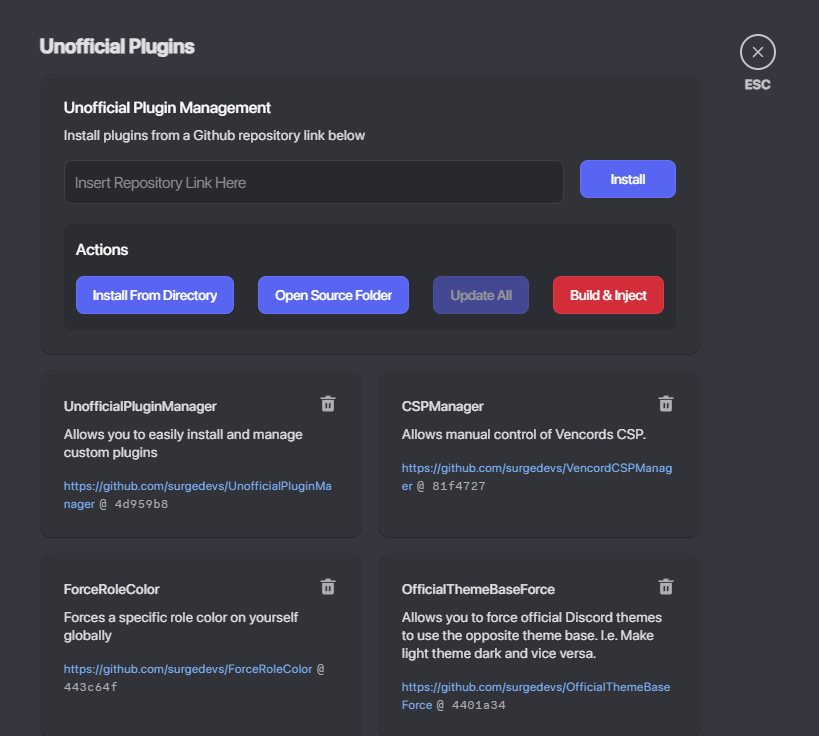UnofficialPluginManager is a Vencord plugin that adds a UI for installing and managing other unofficial plugins.